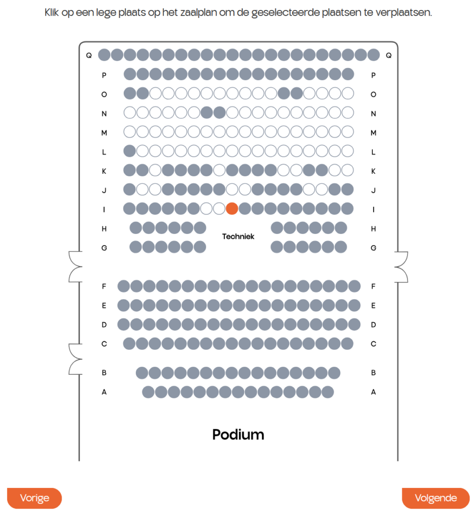 Je kunt je plaats(sen) (oranje cirkel) aanpassen door op een lege stoel (witte cirkel) te klikken in de zaal. Wanneer je meerdere tickets koopt, verschijnen de zitjes naast elkaar op het zaalplan.