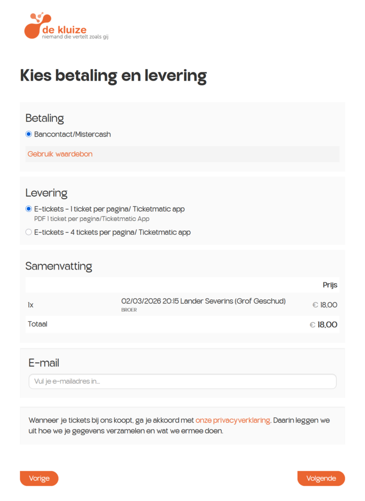 Bij de stap checkout (afrekenen), krijg je een overzicht te zien van alle tickets die je wilt aankopen. Vul je e-mailadres in en klink rechts onderaan op Volgende.
