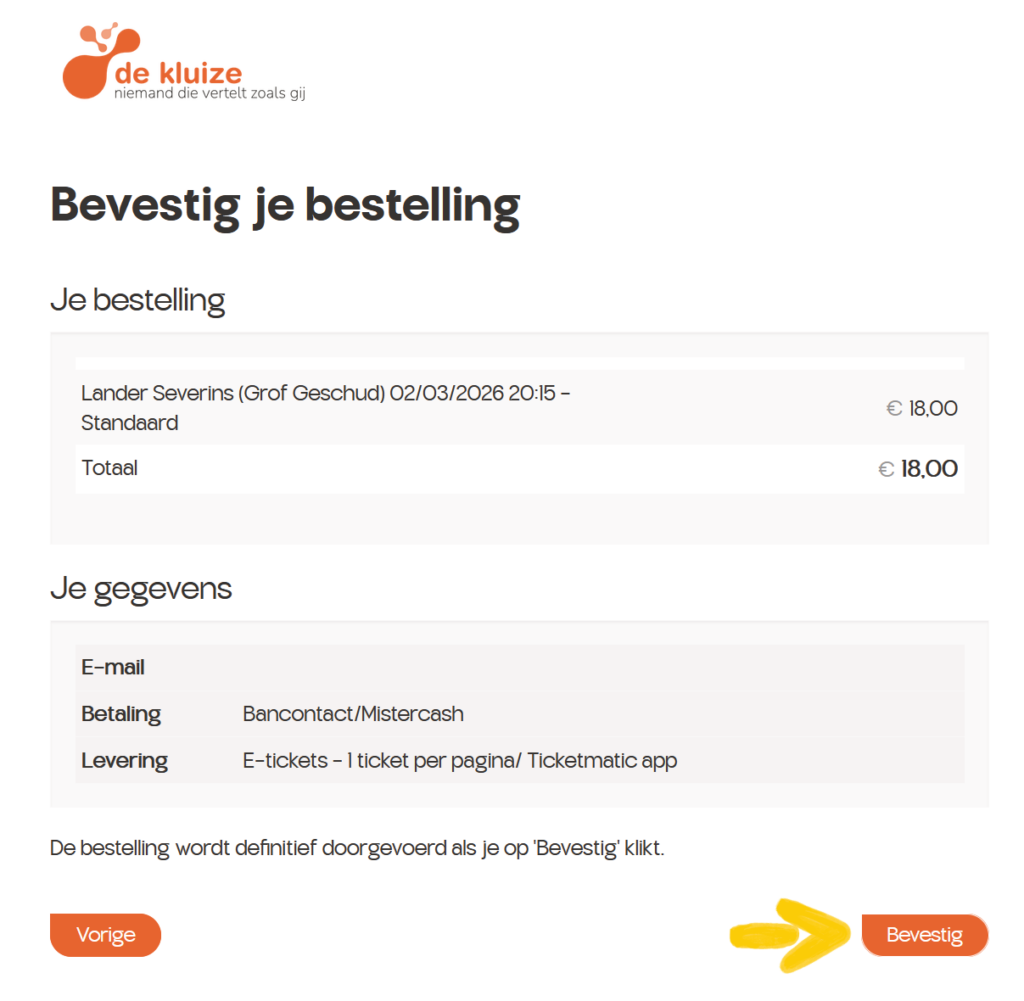 Je ontvangt een bevestiging van de aankoop per e-mail. Indien je gebruik maakt van de TicketMatic app, verschijnen je tickets in de app.