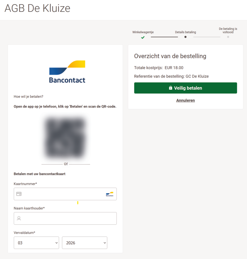 Betaal met Bancontact door de QR-code te scannen met je smartphone (onderstaande afbeelding is ter illustratie; de QR-code vervaagd) OF geef de gegevens van je bankkaart in en gebruik je bankkaart en kaartlezer om de betaling uit te voeren.