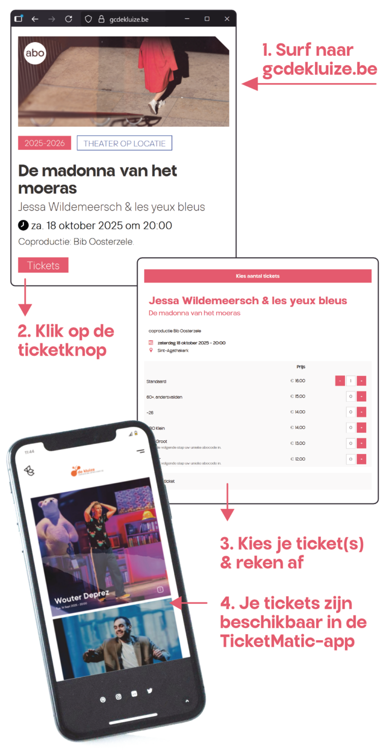 Tickets reserveren kan ook via e-mail naar reservaties@oosterzele.be, bij het Cultuurloket op de 1ste verdieping van CC De Kluize of telefonisch via +32 (0)9 363 83 30