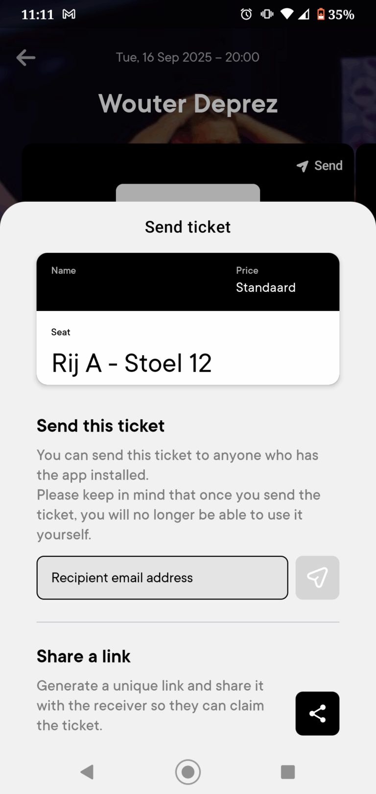 1) Je geeft het e-mailadres in dat gekoppeld is aan de TicketMatic app van de ontvanger in het veld Recipient email address. Indien de ontvanger de app niet heeft geïnstalleerd of een ander e-mailadres gebruikt, krijg je een melding en neem je best even contact op met de ontvanger;